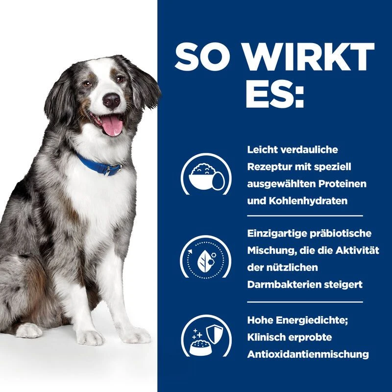 Die hohe Verdaulichkeit von Hills i/d Sensitive schont den Magen, verbessert die Nährstoffaufnahme und unterstützt die Genesung des Magen-Darm-Trakts.